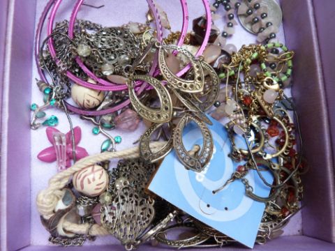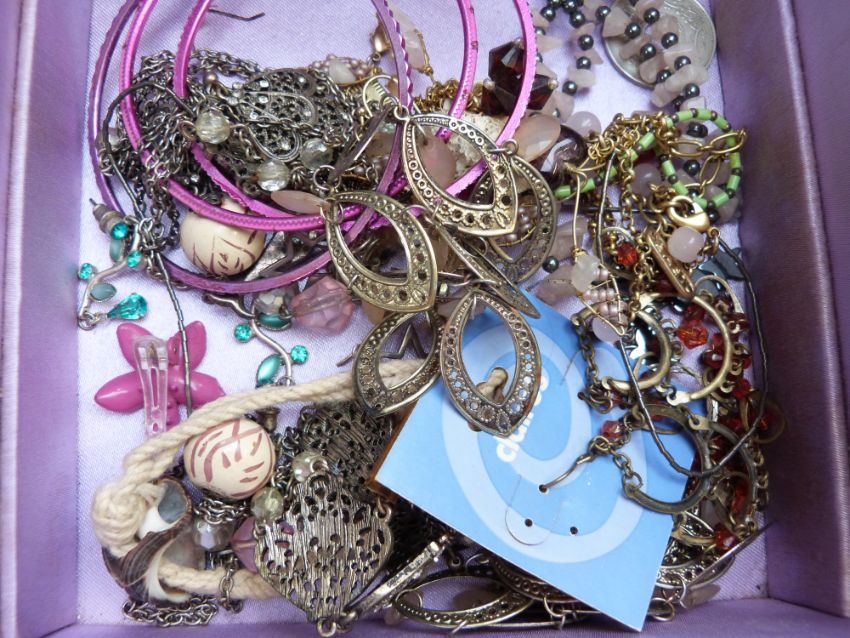 A collection of costume jewellery including amethyst, beaded necklaces, vintage brooches, etc