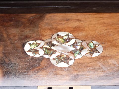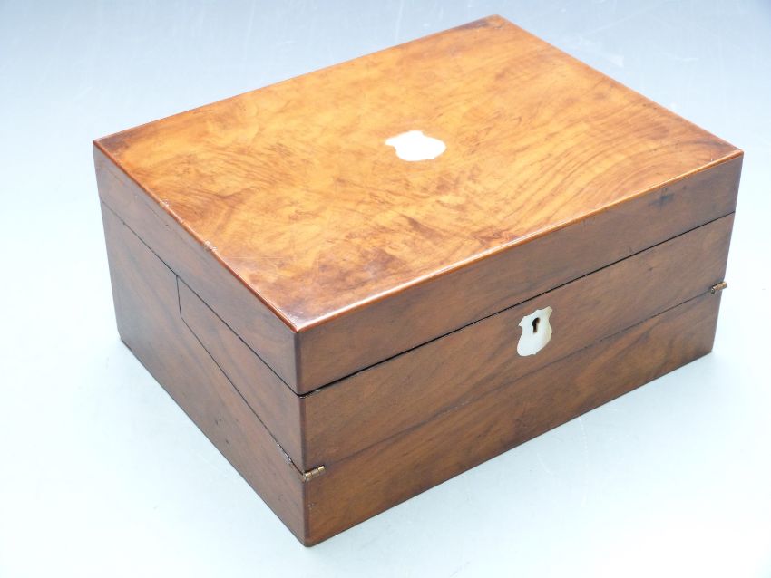 19thC mother of pearl inlaid walnut writing slope and workbox with fold out writing slope, width 30.5cm