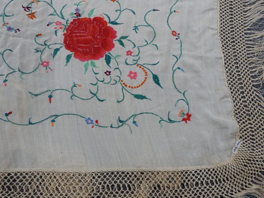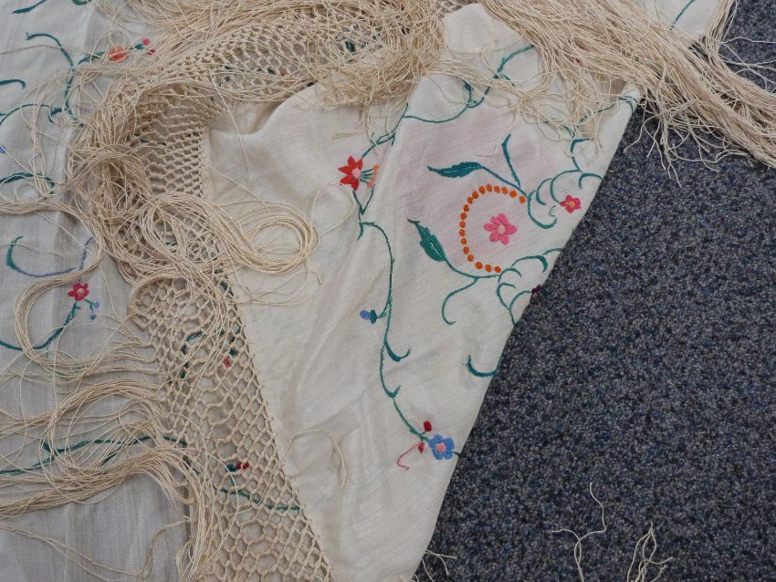 A 19th/20thC Chinese ivory silk shawl with embroidered chrysanthemum decoration and long fringe, 200 x 200cm including fringe