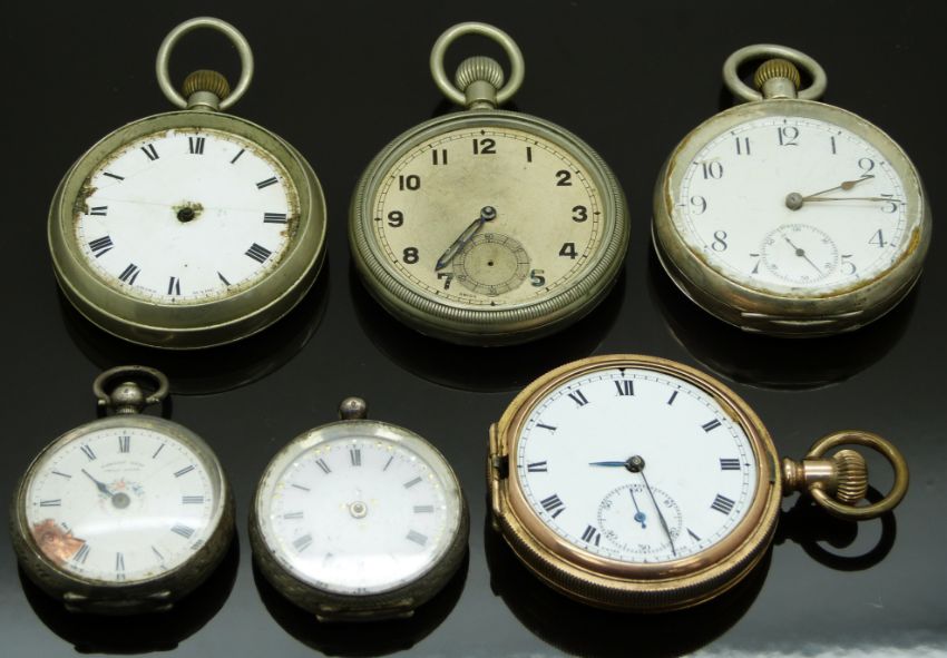 Six various pocket watches comprising a gold plated full hunter, two continental silver ladies fobs, a keyless winding open faced example, a similar military style example and one other.