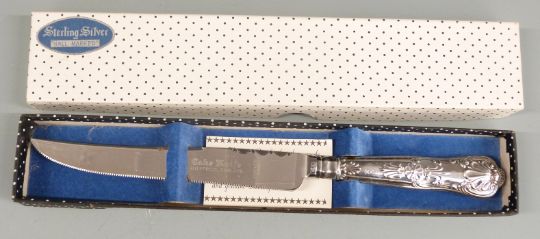Georg Jensen 1973 silver gilt spoon with enamel decoration of a flower, in original box with paperwork, together with a silver-handled cake knife and a hallmarked silver teaspoon