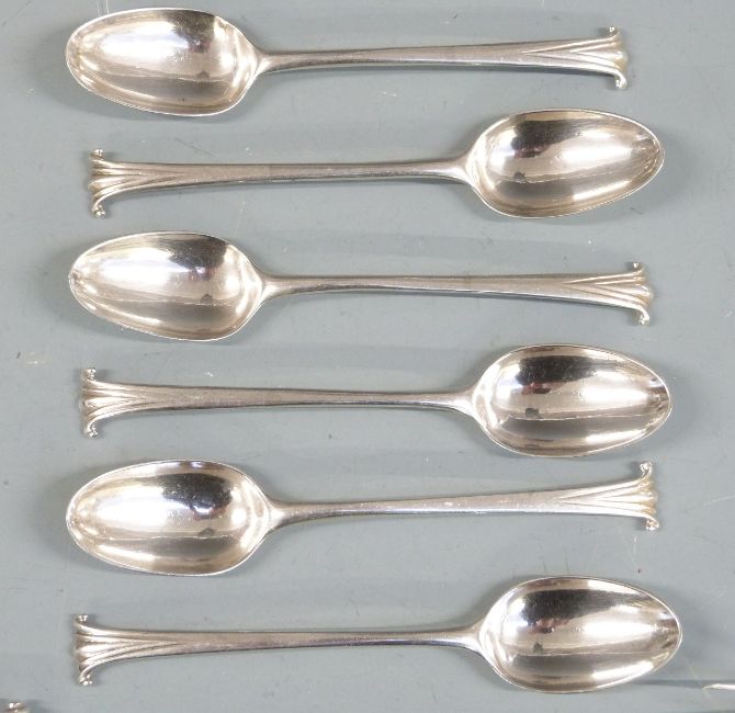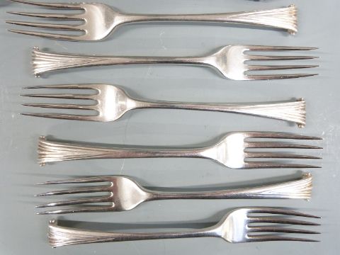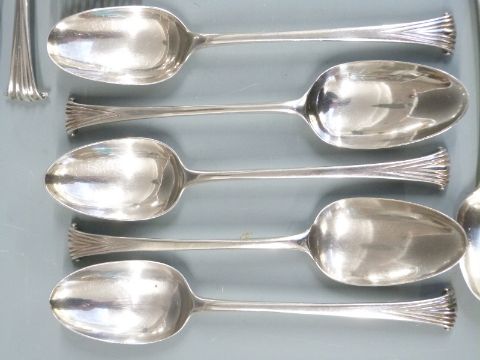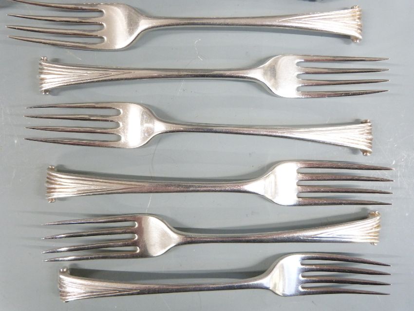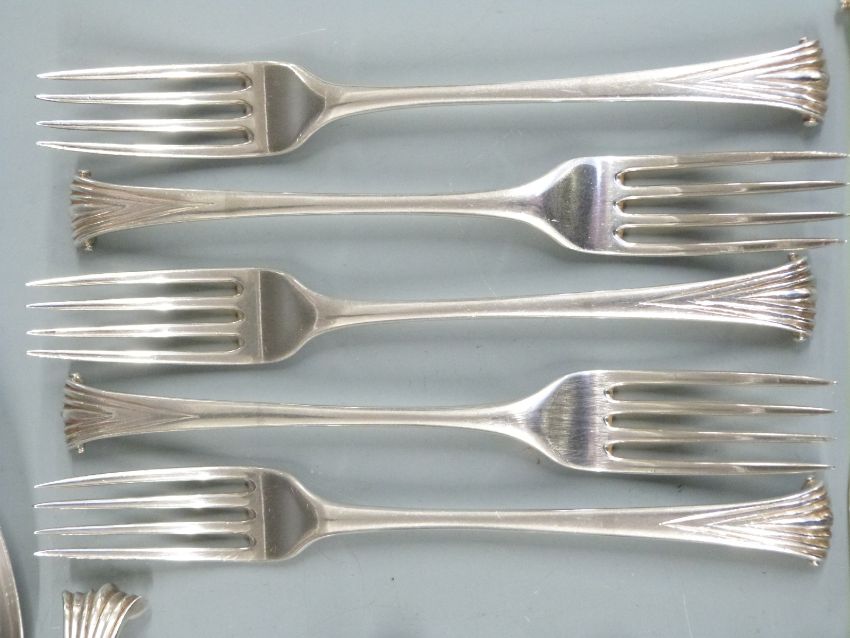 Georgian harlequin canteen of Onslow pattern hallmarked silver cutlery, most being bottom marked, comprising five table forks, six dessert forks, two basting spoons, five table spoons, six dessert spoons, six teaspoons and a sifter ladle, various dates and makers circa 1760-1797 including John Lambe, Thomas & William Chawner and Stephen Adams I, length of basting spoons 26cm, weight 1400g