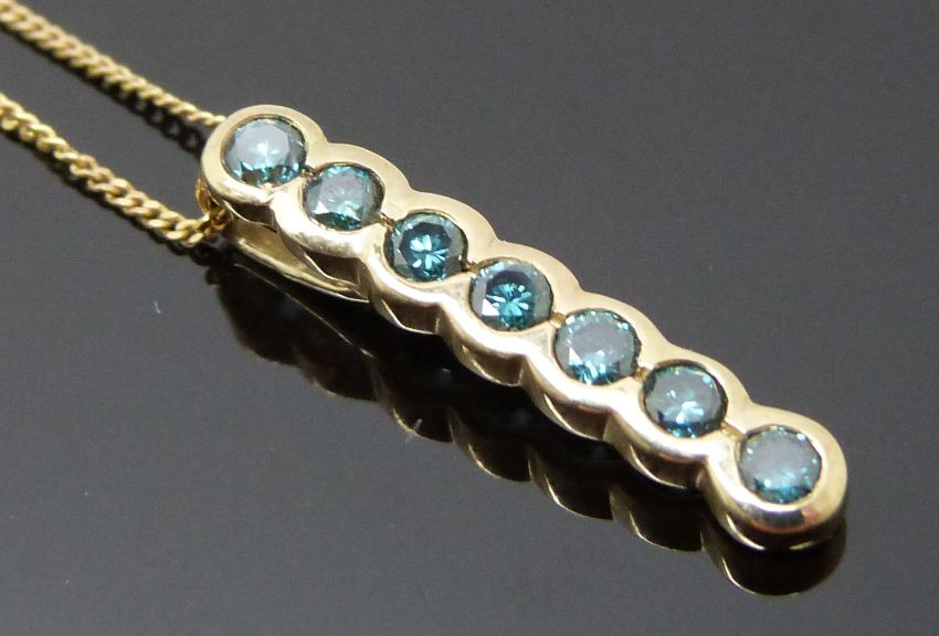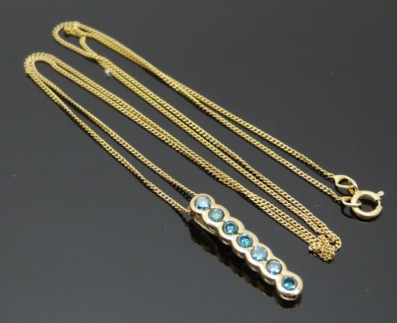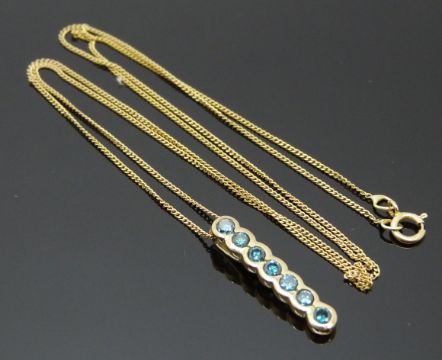 A 9ct gold pendant set with blue diamonds on a 9ct gold chain, 1.6g
