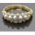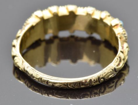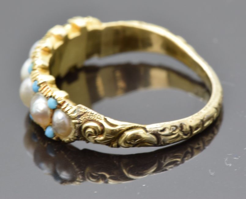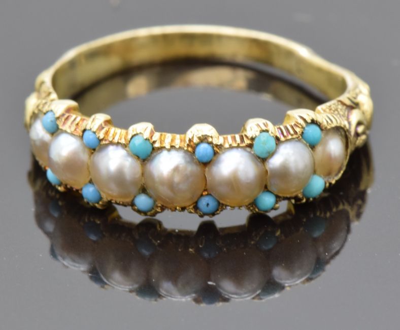 Victorian yellow metal ring set with split pearls and turquoise with an engraved chased band, size K