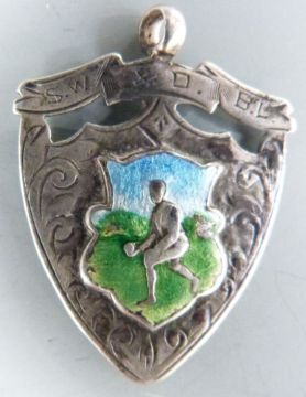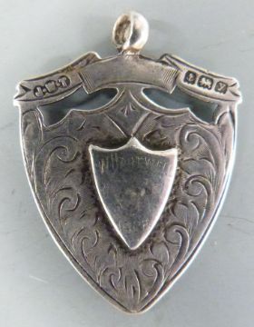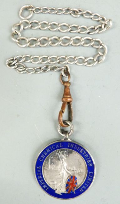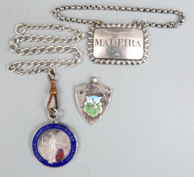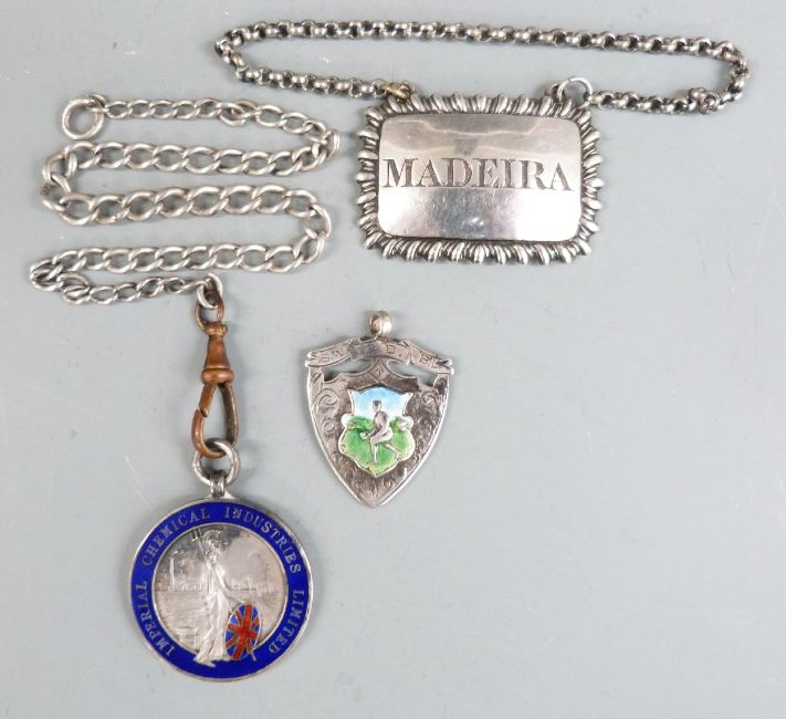 Georgian hallmarked silver Madeira wine ticket or label, Birmingham 1829 maker Joseph Willmore, hallmarked silver ICI metals Ltd enamel 25 years service medallion, hallmarked silver fob and a watch chain