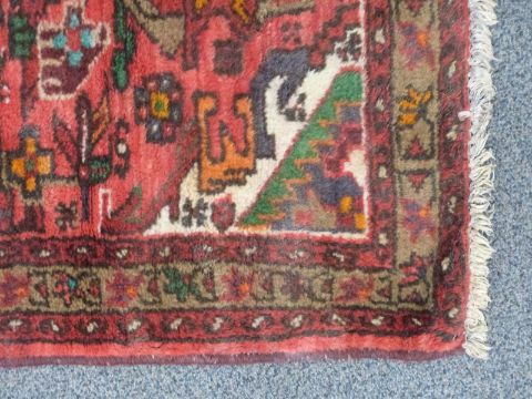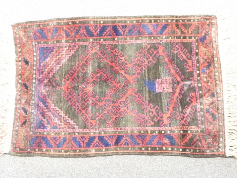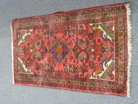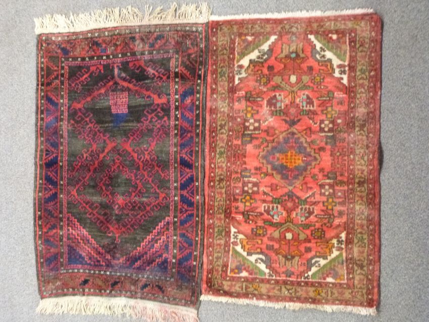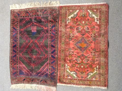 A Persian geometric rug with brown ground, canavar ayagi pattern to central field and bereket motifs to border, 130 x 85cm and a Persian geometric rug with light red ground and central medallion surrounded by floral / akrep style motifs, 124 x 74cm.