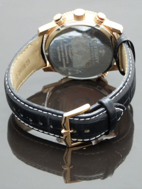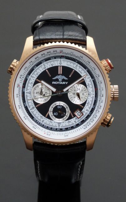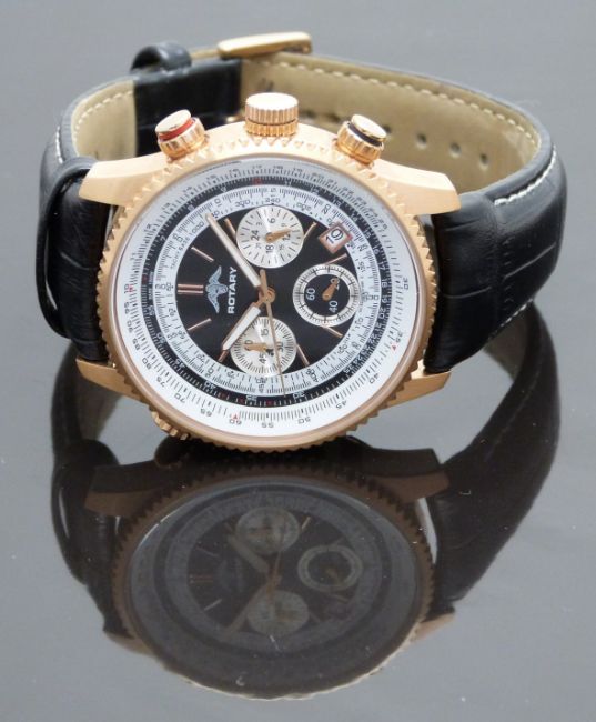 Rotary Aquaspeed pilot's style gentleman's chronograph wristwatch ref. GB00100/06 with date aperture luminous hands, silver subsidiary dials, white tachymetre bezel, white and black dial, gold plated case and quartz movement, on black leather strap, case diameter 42mm, serial number PLO-007092.