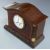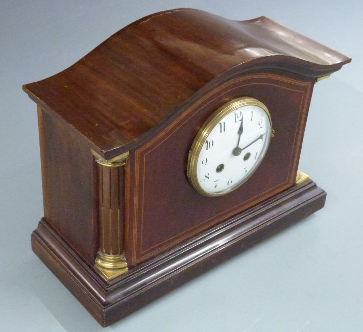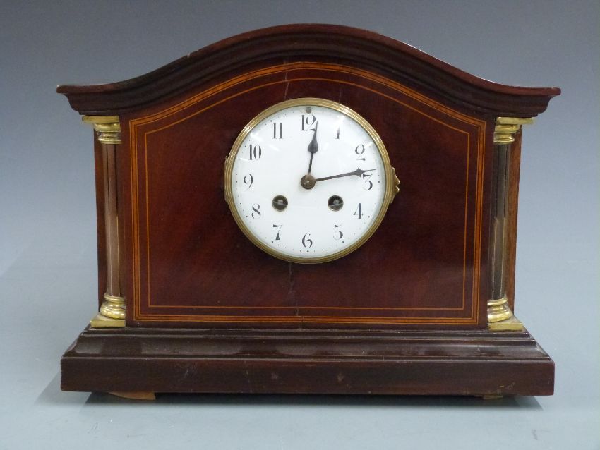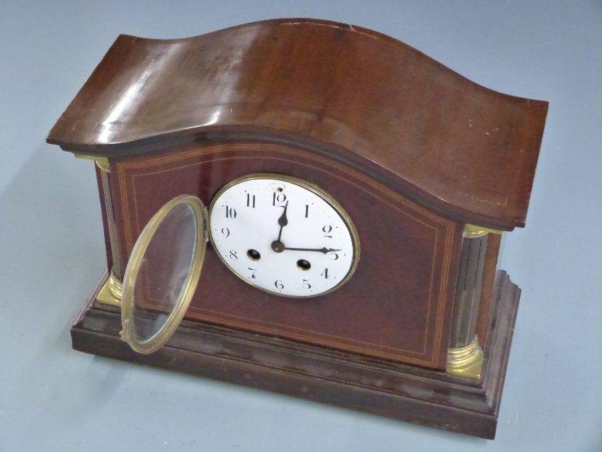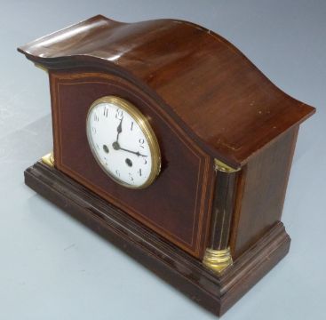 Late 19th/ early 20thC French mantel clock in mahogany case with banded inlaid decoration, reeded quarter columns and brass capitols, the enamelled Arabic dial with spade hands, the two train movement No. 22792 by Marti of Paris striking on a gong, 27cm tall