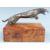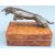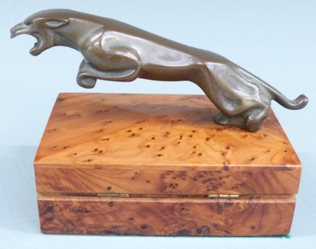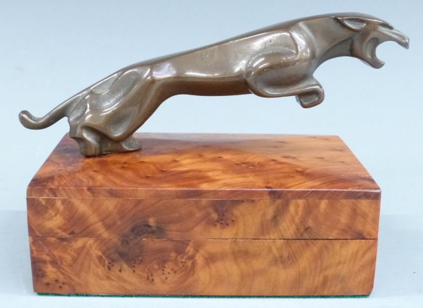 Jaguar car showroom or promotional bronze bottle opener formed as a leaping jaguar, the mouth to be used as a bottle opener, on wooden box display stand, length 16cm