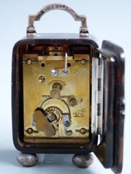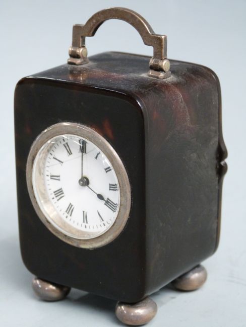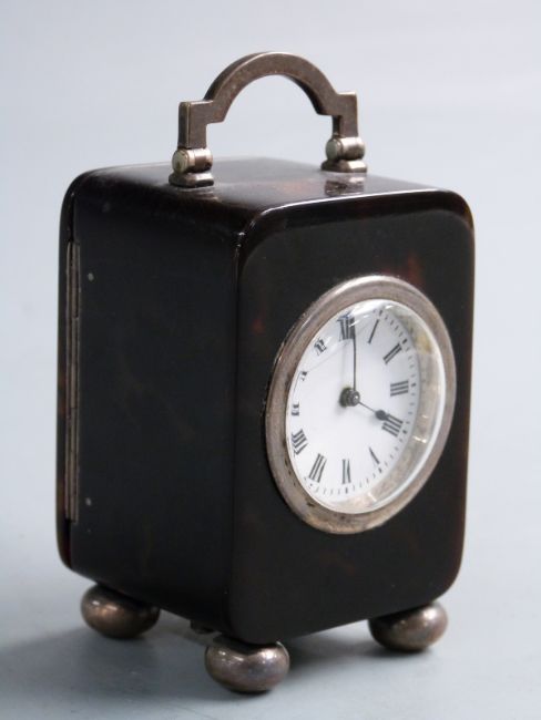 Early 20thC French Boudoir clock, the enamelled Roman dial in tortoiseshell case with silver fittings hallmarked London 1911, the French movement stamped with a lion, raised on bun feet, 8cm tall