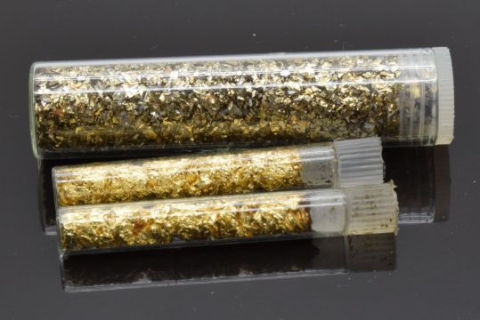 Three containers of gold filings, weight with containers 17.9g