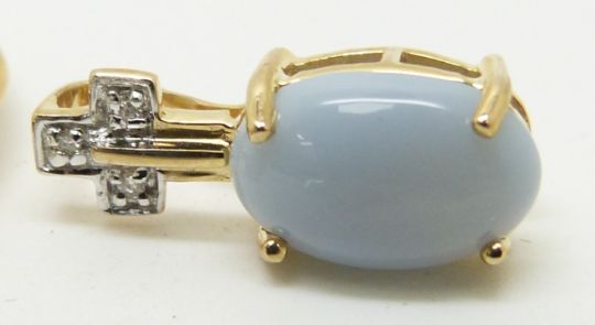 A 9ct gold ring (size N), earrings and pendant set with blue fire opal cabochons and diamonds, 5.9g