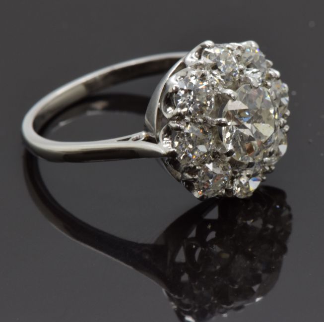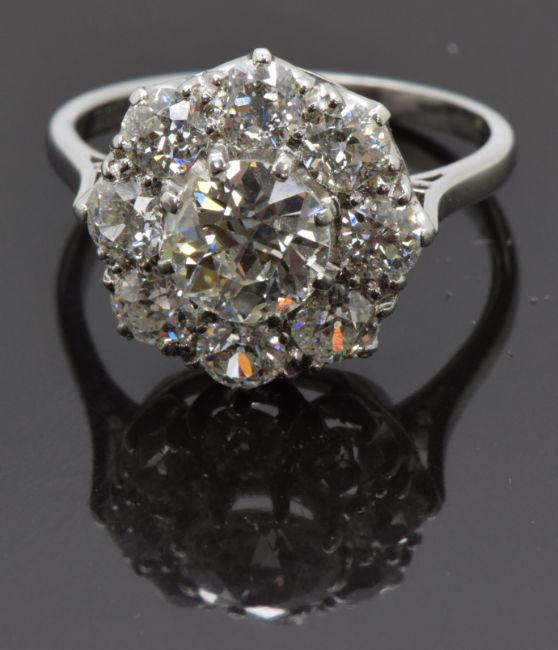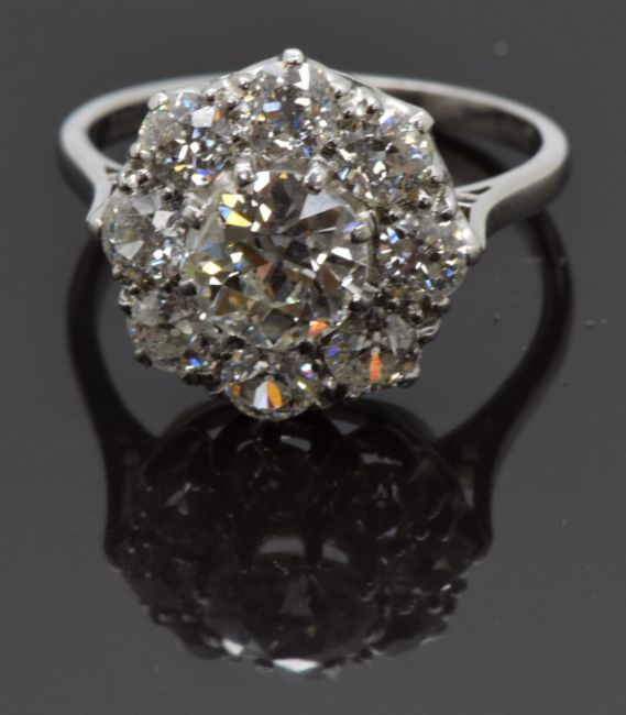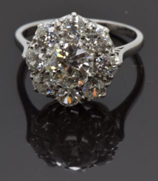A platinum ring set with a round cut diamond of approximately 1.3ct surrounded by eight further diamonds of approximately 0.18ct, total diamond weight approximately 2.75ct, size P, 5.93g