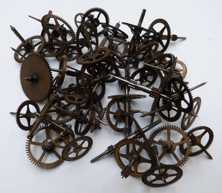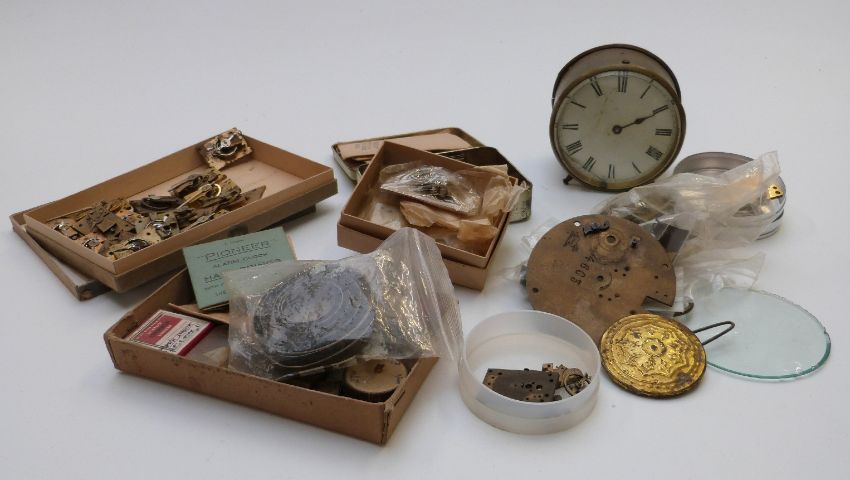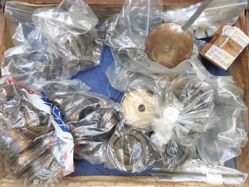A quantity of various clock parts including new mainsprings, escape wheels, hands etc