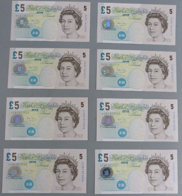 Four consecutive Andrew Bailey UK £5 notes, LC84974624-LC84974627, together with a further four KK57923269-KK57923272, all uncirculated