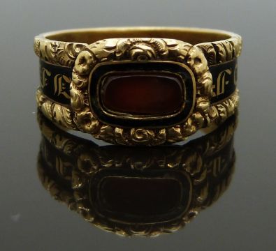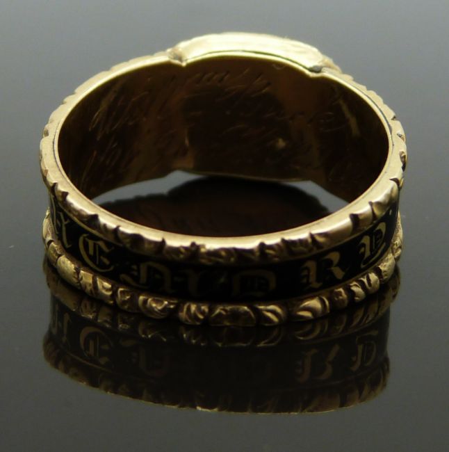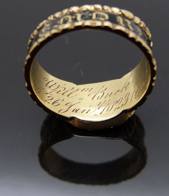 Georgian 18ct gold mourning ring set with a glass compartment surrounded by black enamel and foliate border, with further black enamel to the band reading "In memory of", inner band inscribed "William Buck Obt 26th 1823 at 68", hallmarked London 1822, maker JS, size K, 4.40g