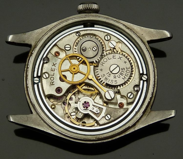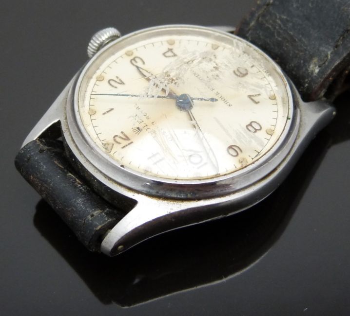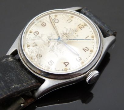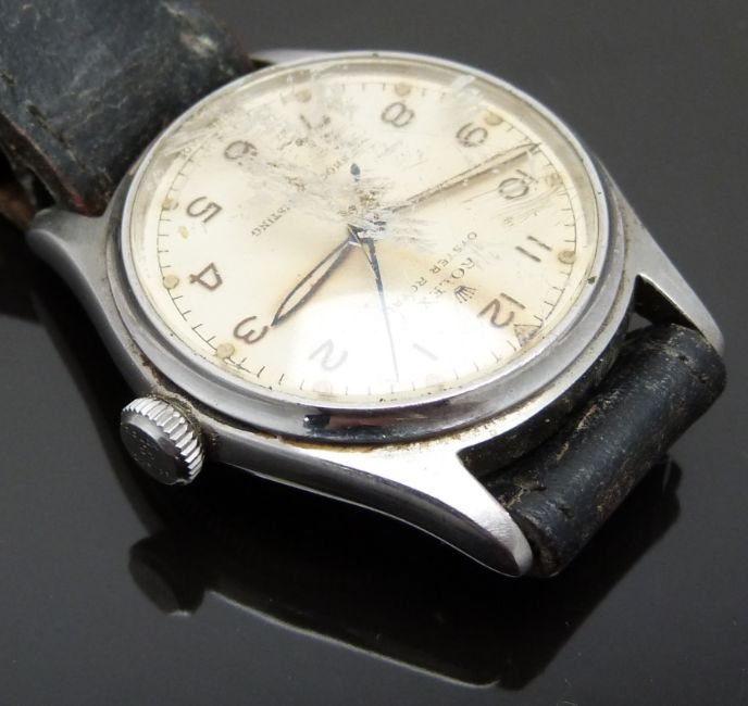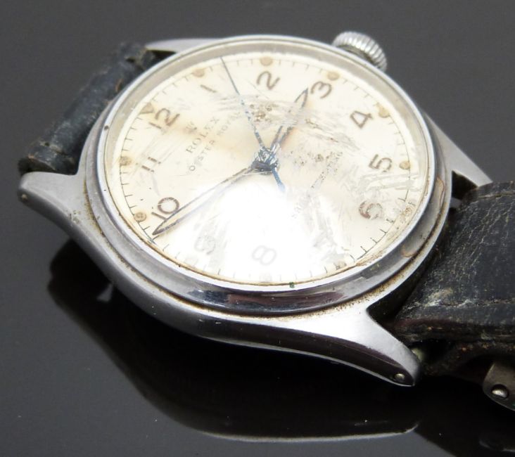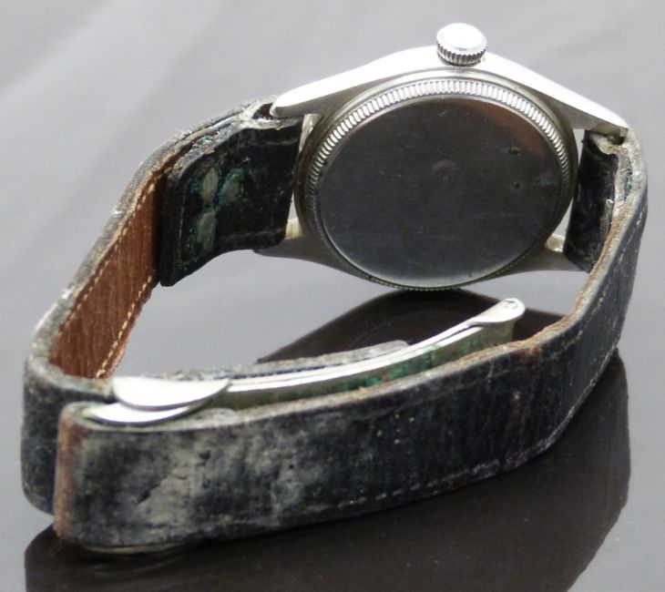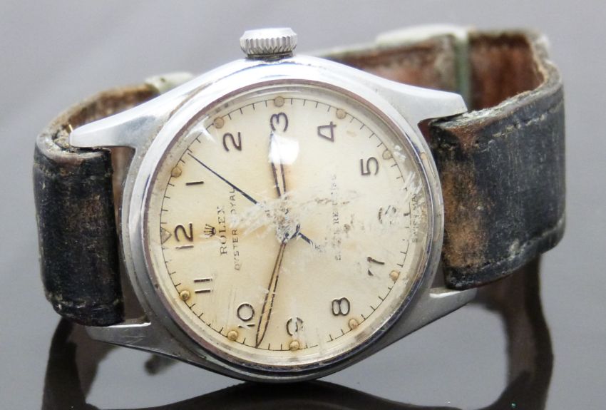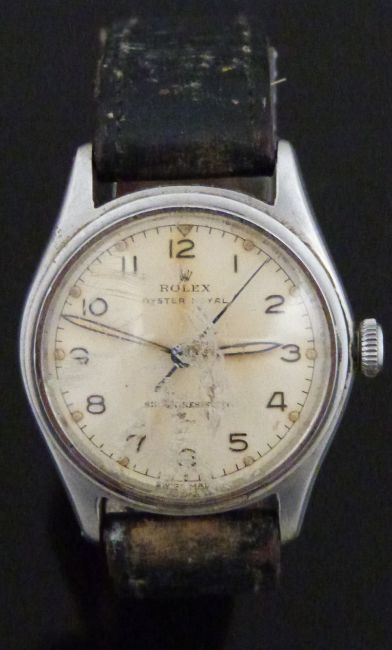 Rolex Oyster Royal gentleman's wristwatch ref. 4444 with Arabic numerals, luminous hour and minutes hands, blued centre seconds hand, cream dial, stainless steel case and signed 15 jewel movement, on back leather strap, case diameter 31mm, serial number 505024.