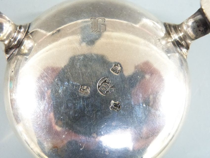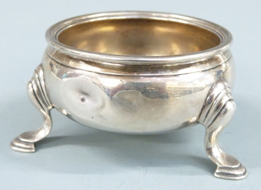 Georgian hallmarked silver salt raised on three feet, London 1748 maker Edward Wood, diameter 7.5cm, weight 94g