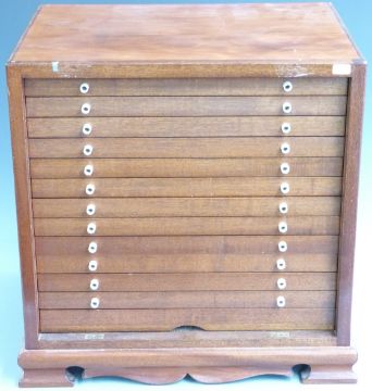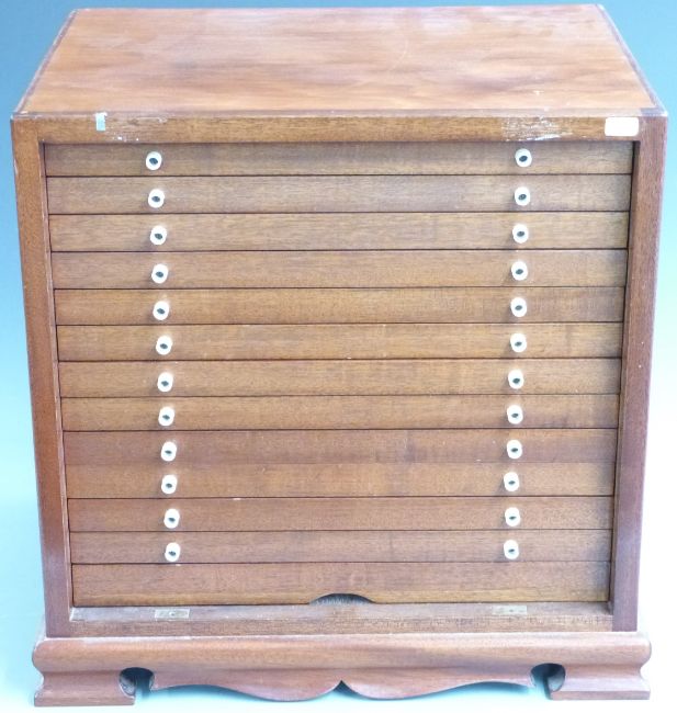 Mahogany thirteen drawer collector's cabinet with removable front, W47 x D36 x H46cm.