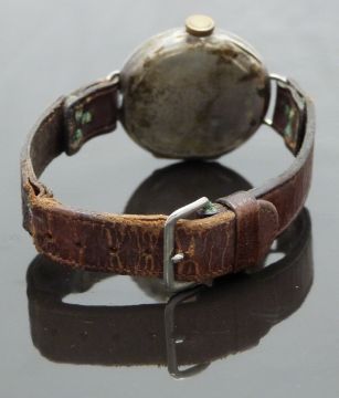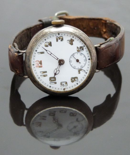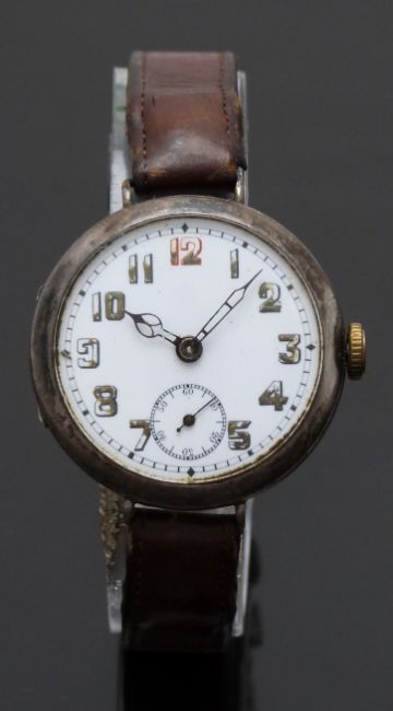 Gentleman's military style silver wristwatch with subsidiary seconds dial, pierced hands, Arabic numerals, white enamel dial and unsigned movement, on brown leather strap, case diameter 34mm, serial number 300622.