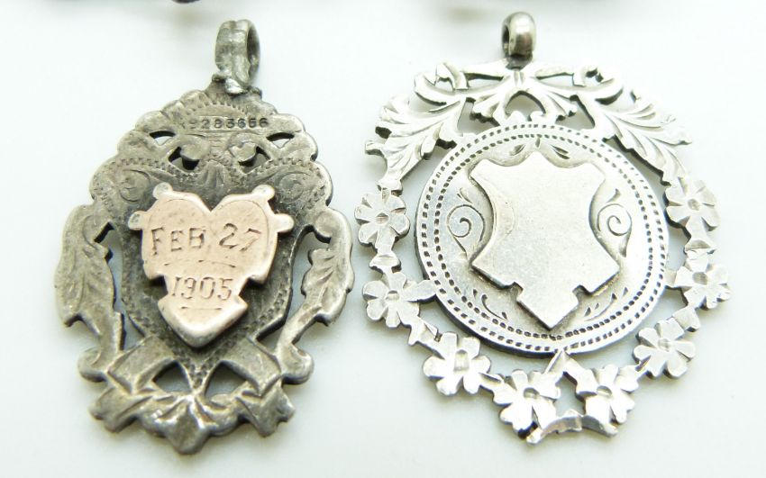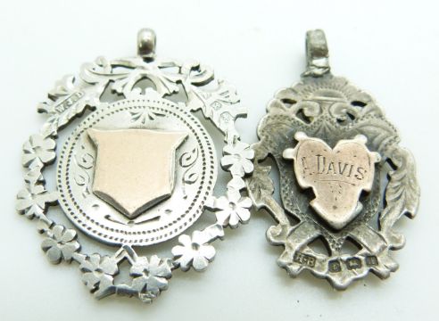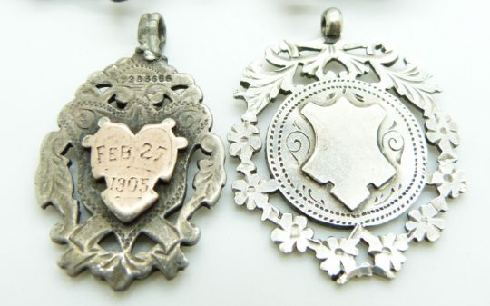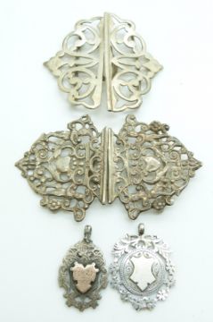 Victorian silver buckle with heart and cherub decoration (Birmingham 1898), an Edwardian silver buckle (Birmingham 1901) and two hallmarked silver fobs
