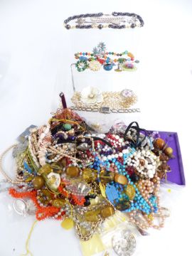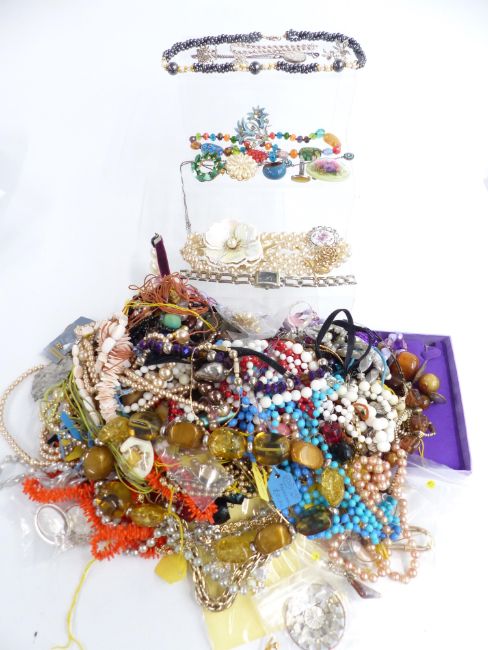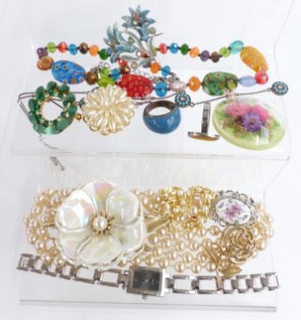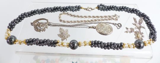 A collection of costume jewellery including silver locket, silver bracelet, beads, Sarah Coventry brooch and necklace, Miracle brooch, etc