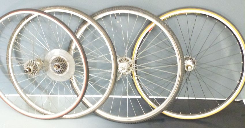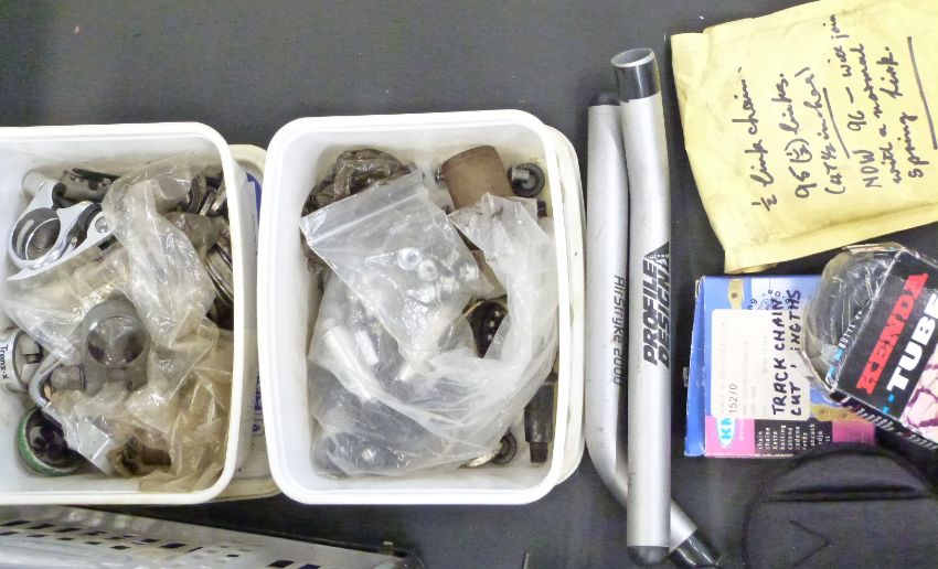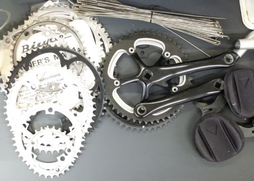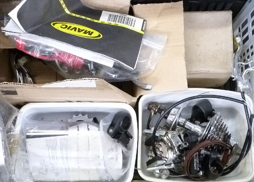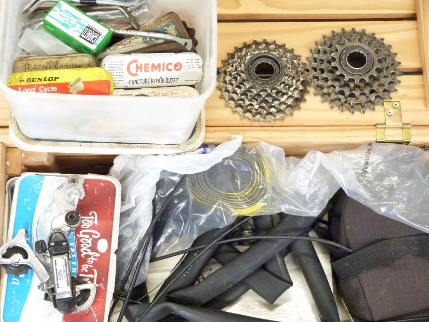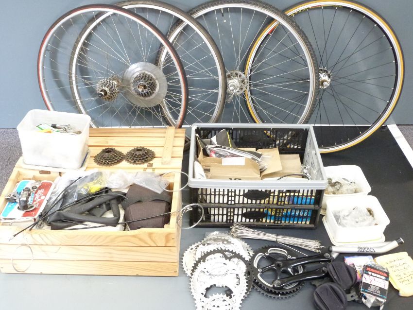 Large collection of bicycle components including four rear wheels, chain sets, Shimano derailleur etc