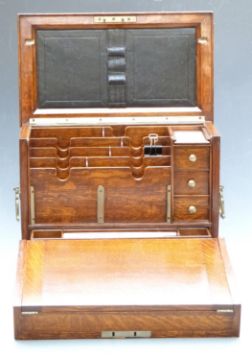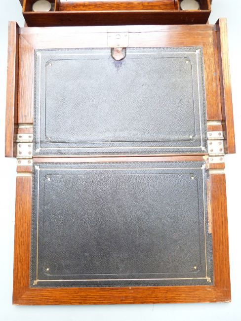 Oak travelling writing slope stationery box, the fold out slope opening to reveal fitted interior and tooled leather writing slope, width 37cm