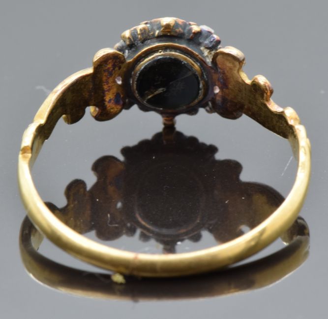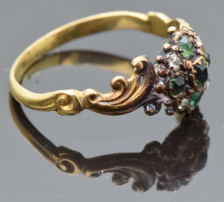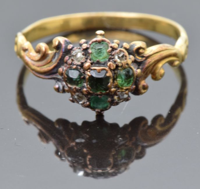 An early Victorian ring set with emeralds and diamonds, with scrolling shoulders and to the underside a glass compartment, size N