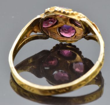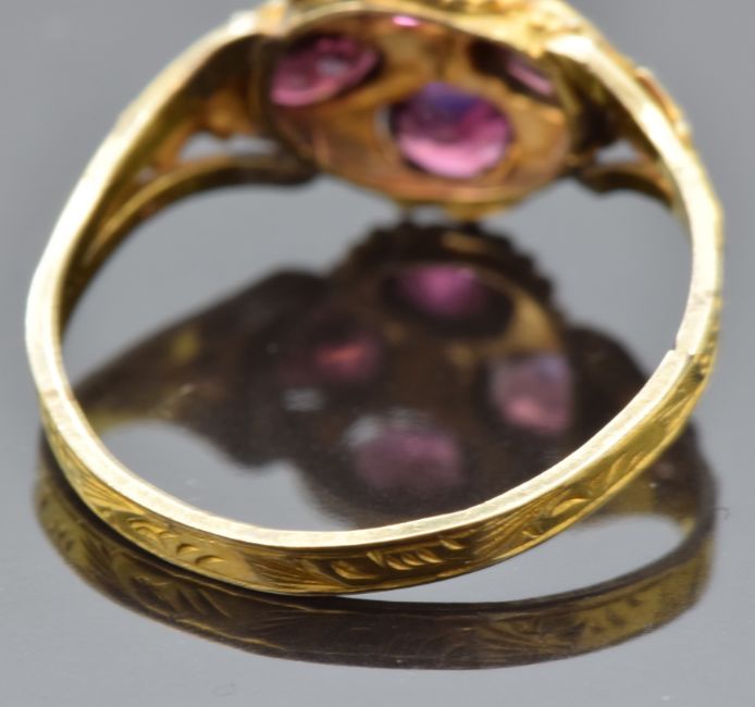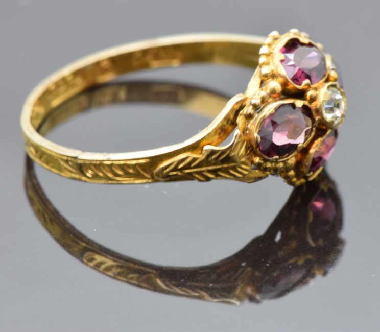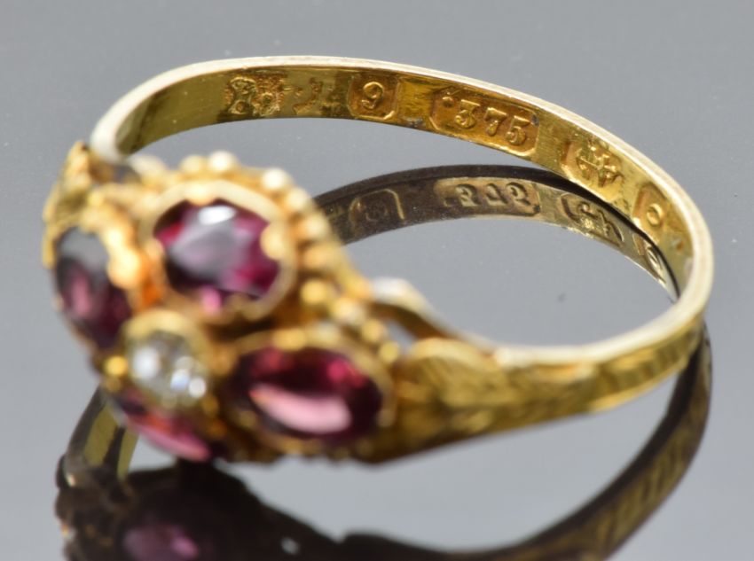 Victorian 9ct gold ring set with an old cut diamond surrounded by garnets, with engraved band and foliate shoulders, maker RP, Birmingham 1863, size K