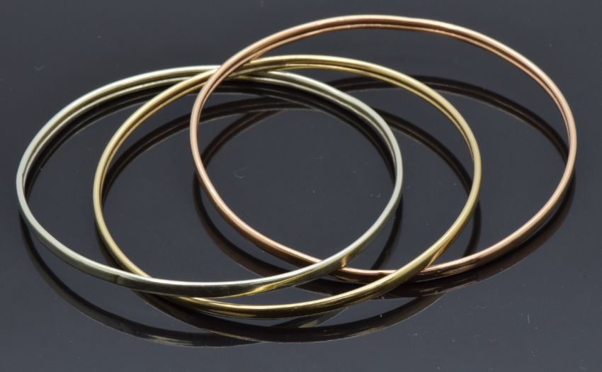 A 9ct gold tri-coloured bangle made up of three linked bangles, 9.4g