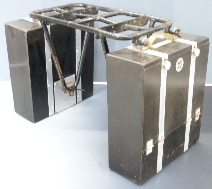 Pair of vintage or classic motorcycle panniers with mounting farme, height 42.5cm