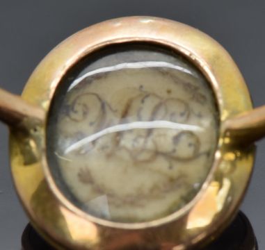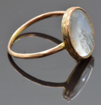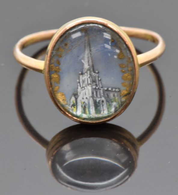 Georgian / Victorian mourning / love token ring set with a painted miniature of a cathedral, verso initials in a glass compartment, size P, 2.41g