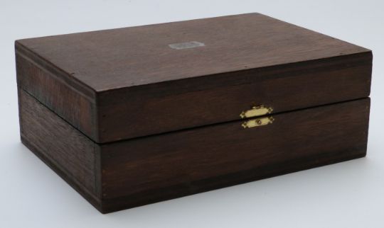 A clock spring winding tool set in wooden case
