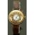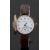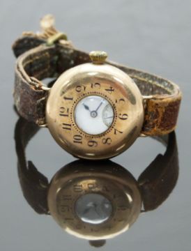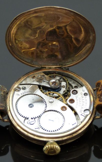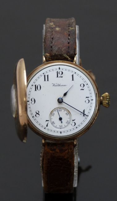 Waltham 9ct gold half hunter wristwatch with inset subsidiary seconds dial, blued hands, black Arabic numerals, white enamel dial, inlaid blue enamel numerals to the case and signed 15 jewel movement, on brown leather strap, case diameter 32mm, serial number 19306086.