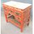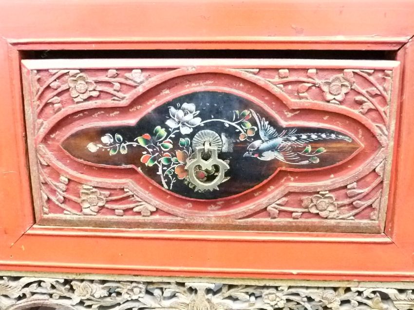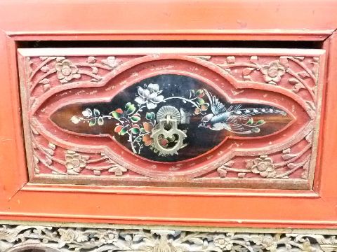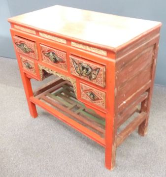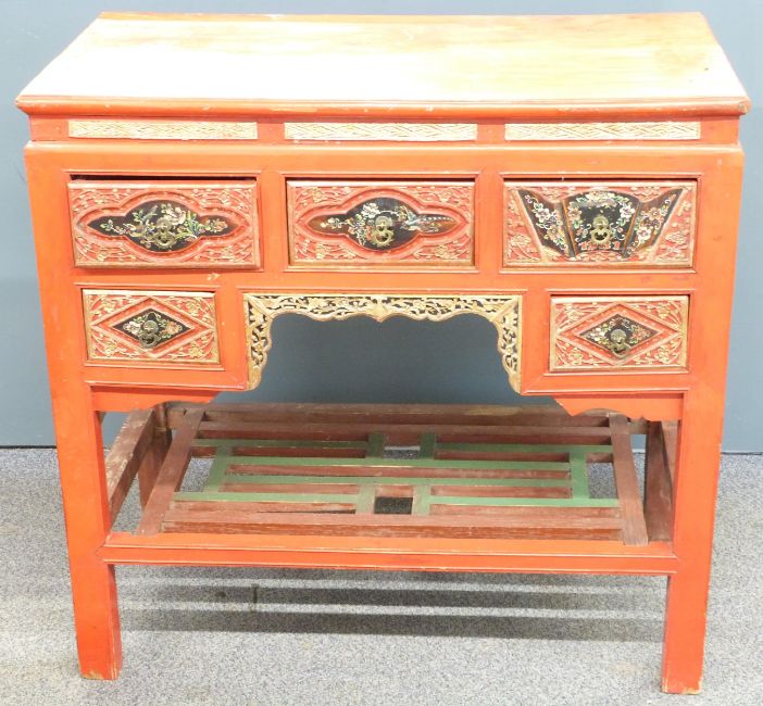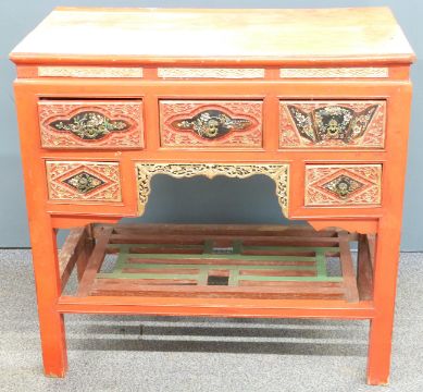 Oriental red lacquer desk with carved and pierced decoration highlighted in gilt and painted scenes to the drawer fronts, W91 x D46 x H89cm