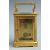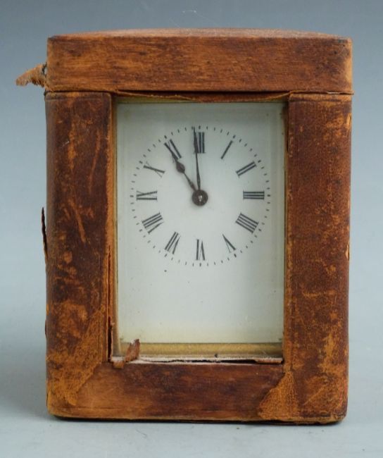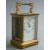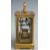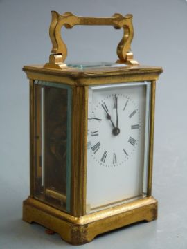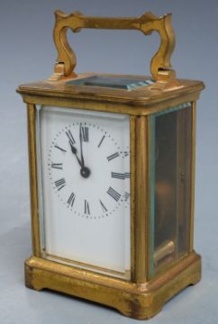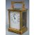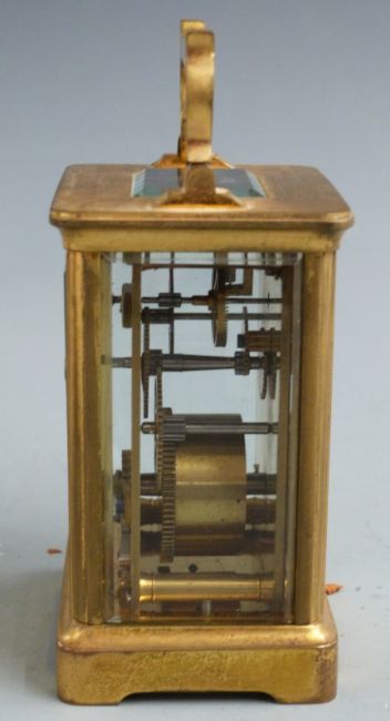 Late 19thC French brass carriage clock in corniche style case, the enamelled Roman dial with blued spade hands, the movement stamped R and Co Paris, inscription to top 'to Isabel Gray from F.E and C.P.C Austin in remembrance of 1883-1897', with original carry case, 11cm tall