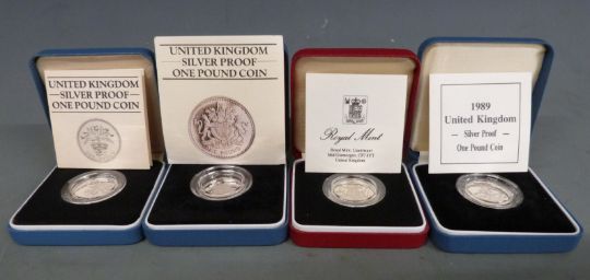 Royal Mint silver proof £1 coins comprising 1983, 1984, 1988 and 1989, various reverse designs, all cased with certificates
