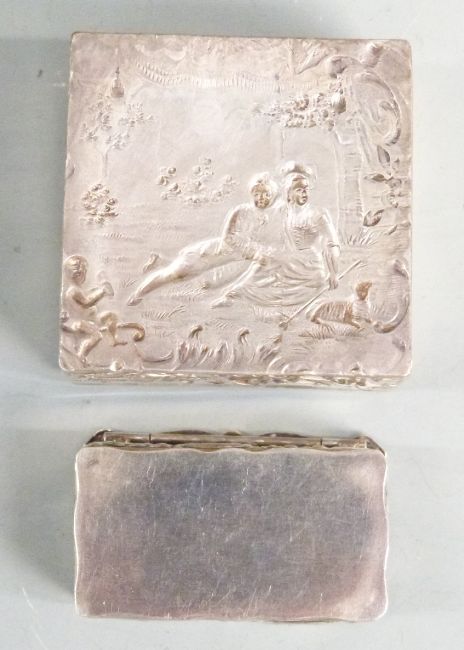 Two modern hallmarked silver trinket boxes, both with embossed decoration, one depicting a courting couple, length of larger 4.5cm, weight of both 73g