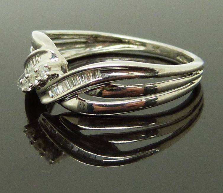 A 9ct white gold ring set with round and baguette cut diamonds, size O, 2.60g