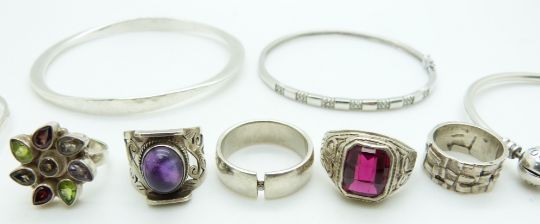 Four silver bangles, five silver rings, one set with a diamond, a silver pendant and chain