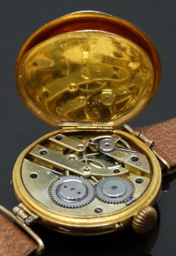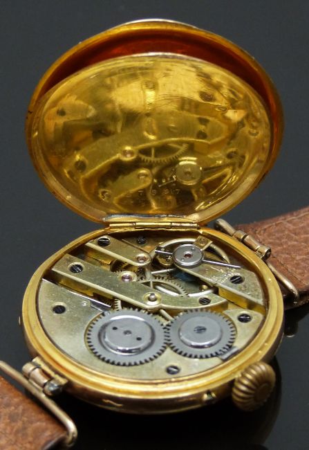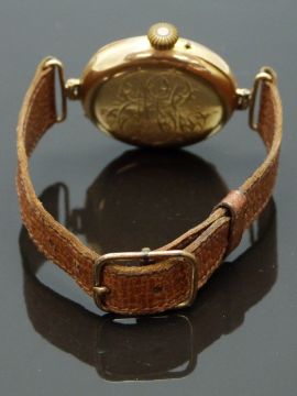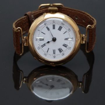 French gold gentleman's wristwatch with blued hands, black Roman numerals, gilt minute markers and unsigned movement, on brown leather strap, case diameter 32mm, serial number 37987.