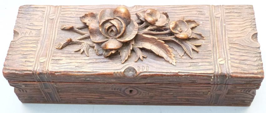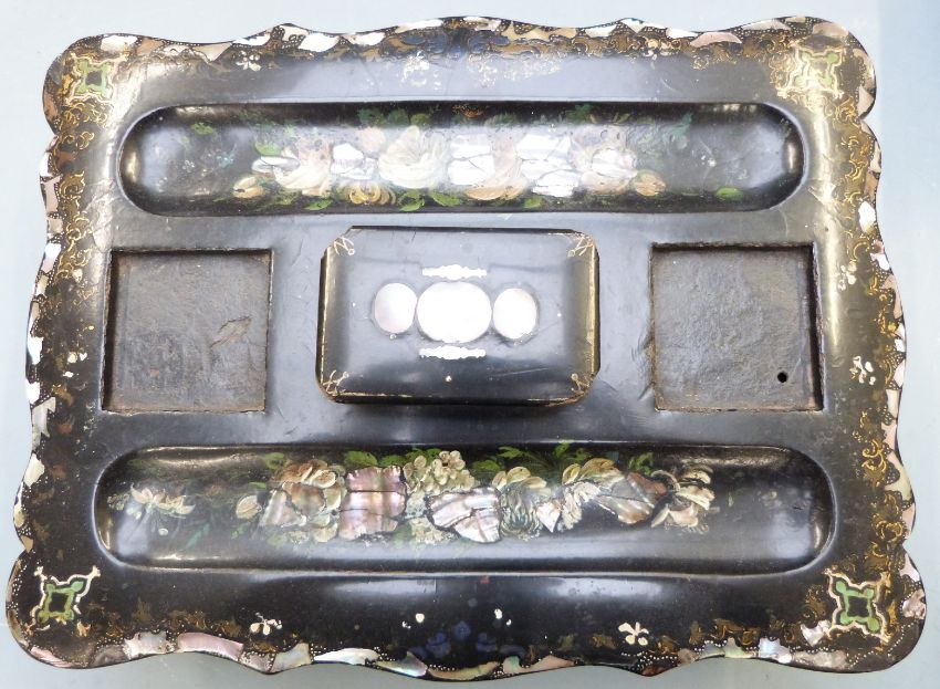 Jennens & Bettridge style mother of pearl inlaid papier maché desk stand with drawer, width 31cm, Georgian mahogany tea caddy and a Black Forest glove box, largest 31 x 22cm