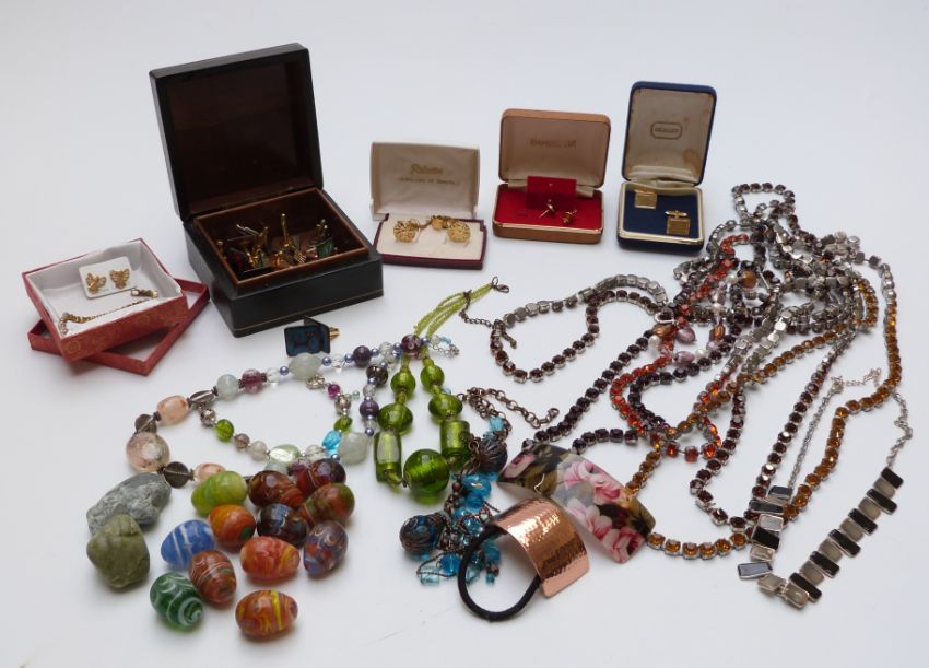 A collection of costume jewellery including enamel cufflinks, necklaces, brooches, etc