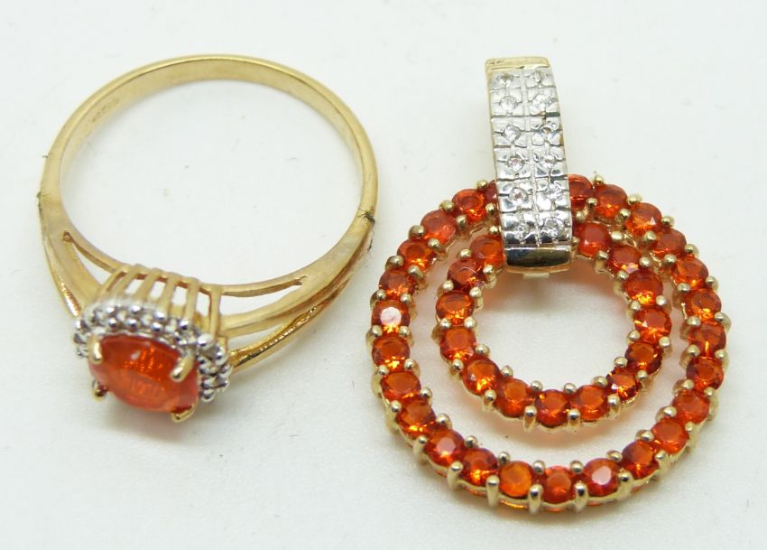 A 9ct gold ring set with a round cut Mexican fire opal and white sapphires and a 9ct gold pendant set with fire opals and zircons, 4.8g, size M