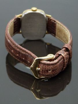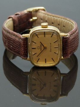 Omega ladies wristwatch ref. 511.413 with black hands and baton markers, gold dial, gold plated case and signed calibre 625 movement, on brown leather strap, case diameter 24mm, serial number 35196611.