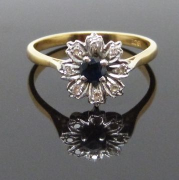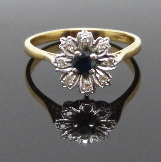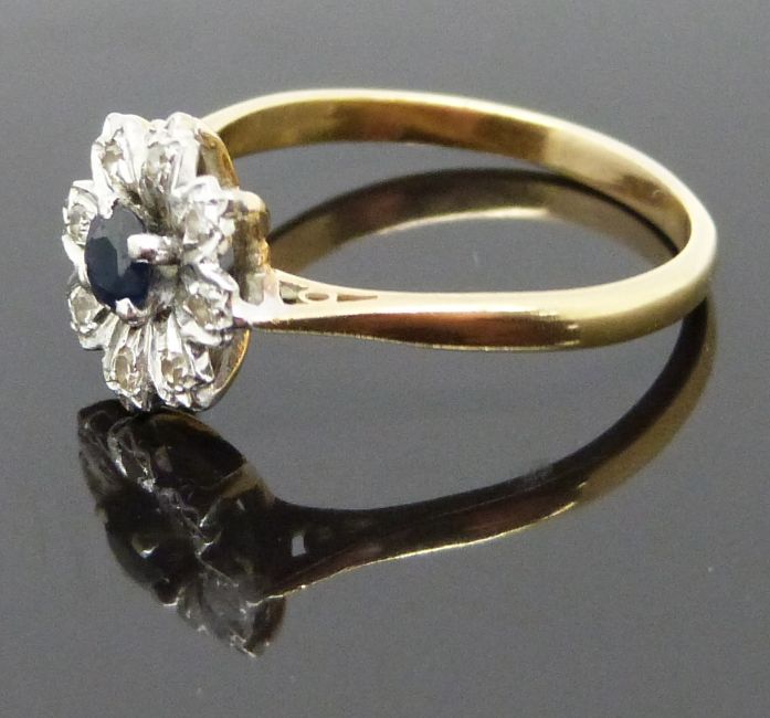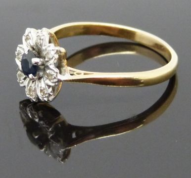 An 18ct gold ring set with a sapphire and diamonds in a flower setting, size P, 3.1g