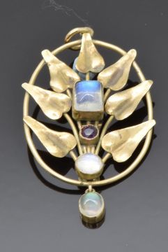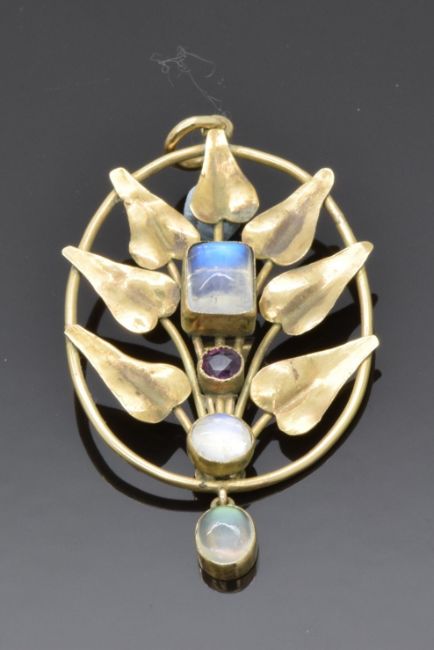 Arts & Crafts 9ct gold pendant set with rectangular, circular and oval moonstones and a garnet in a foliate design, 4.5cm long