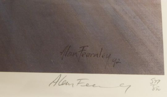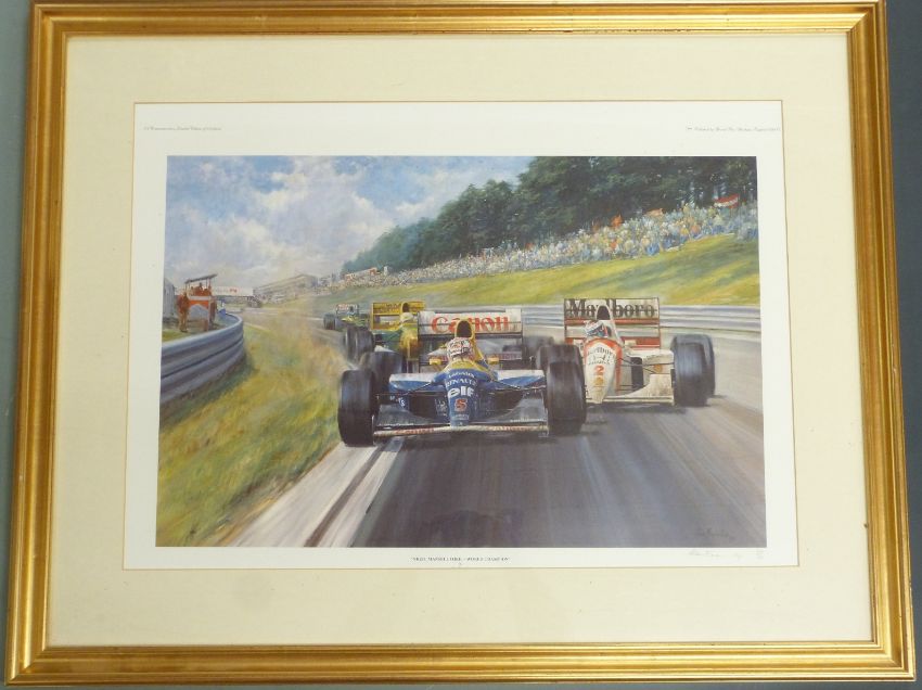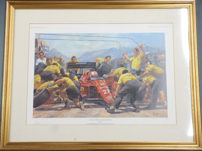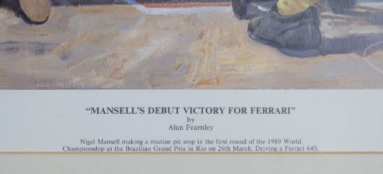Alan Fernley two signed limited edition prints, both limited to 850, comprising Mansell's debut Victory for Ferrari (also signed by Nigel Mansell lower left) and Nigel Mansell OBE World Champion, each 43 x 61cm
