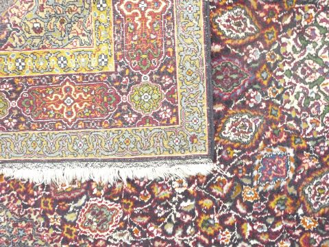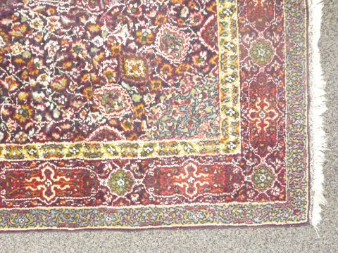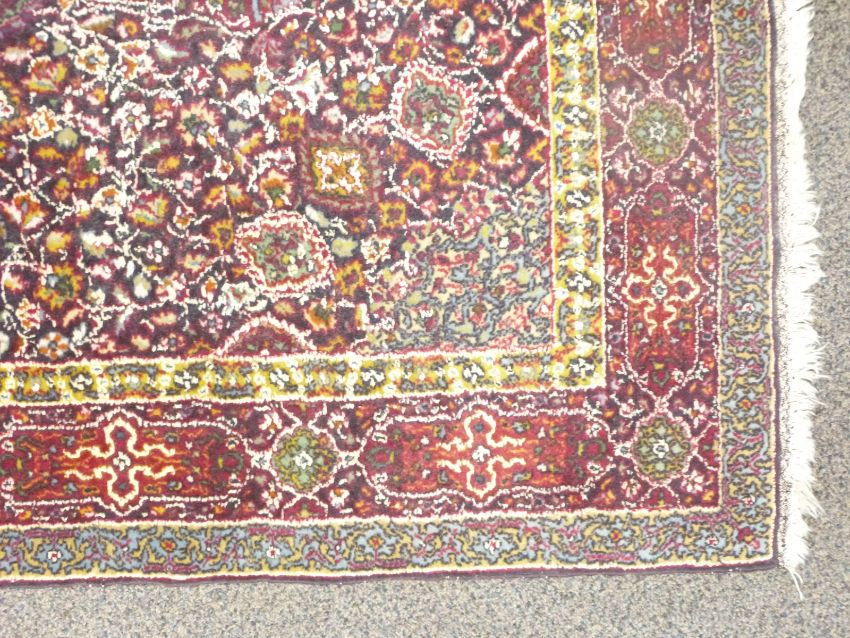 Kashmiri woollen rug with white geometric rosette design on deep blue ground, 166cm x 90cm